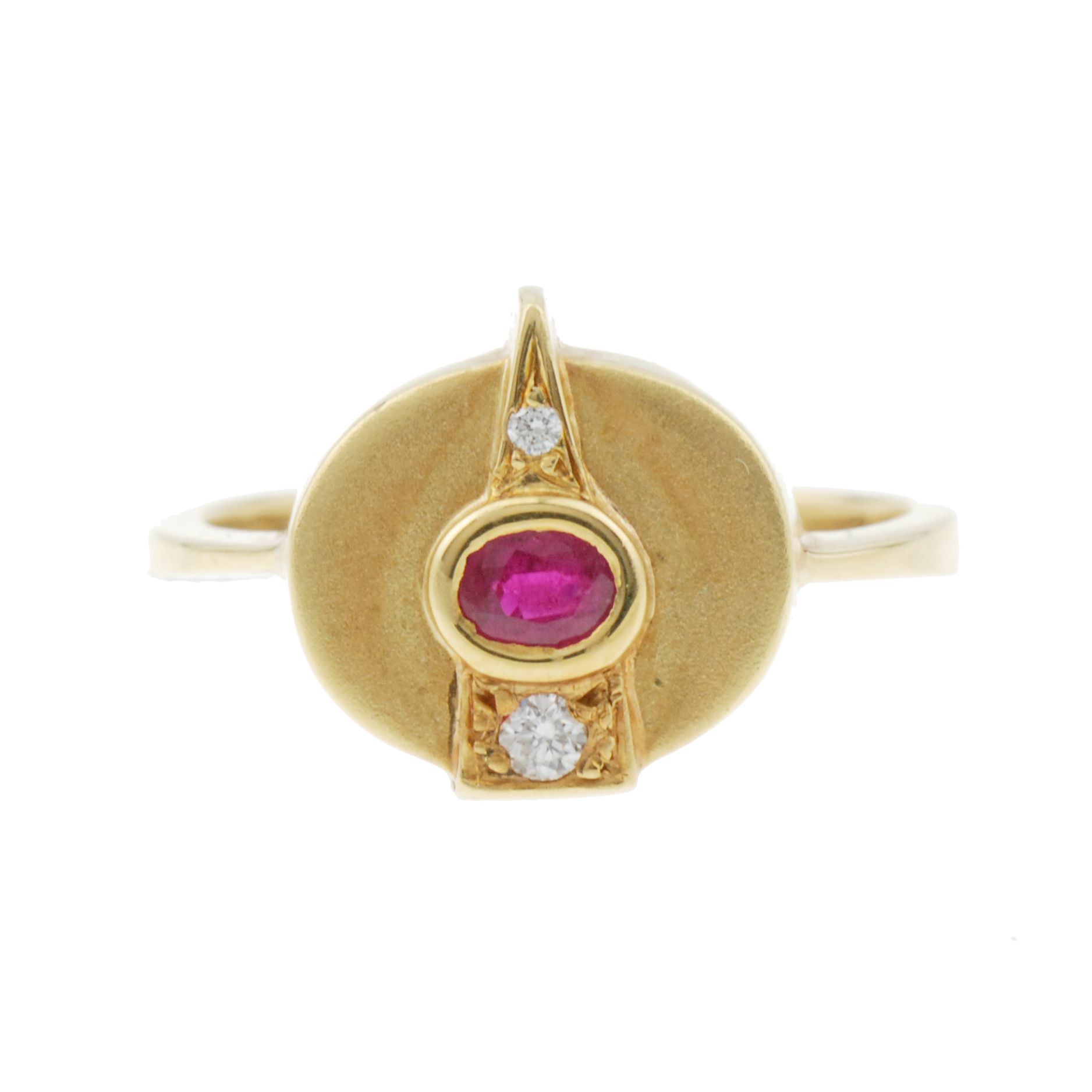 Oro amarillo con rubí central de talla oval de un peso total aprox. 0,10 ct, y dos pequeños diamantes 0,06 ct. Peso total 3,6 gr. Medida aro 17 mm.