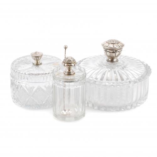 Se añaden dos botes y bote para mermelada en cristal tallado con tapas en plata.