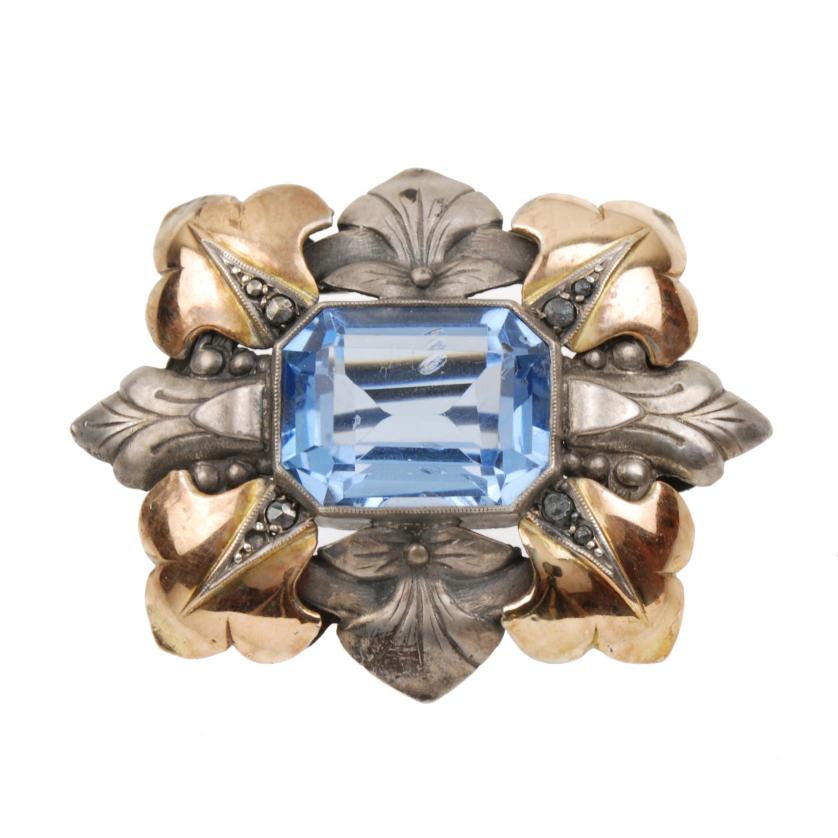 85. Silver and gold with central baguette-cut spinel. 4 x 3 cm.9,3 gr.