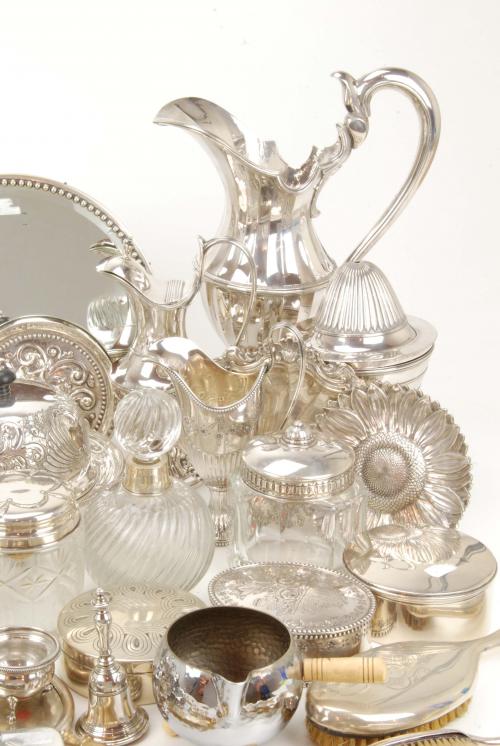 Some pieces of silver with city of Lisbon hallmark. Dressing table set, various boxes & centrepieces, coffeepot, salt-cellars, cutlery, bell, round table top mirror, dressing table flasks & jars. Some flaws and dents. 2.903kg approx weight