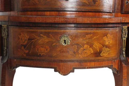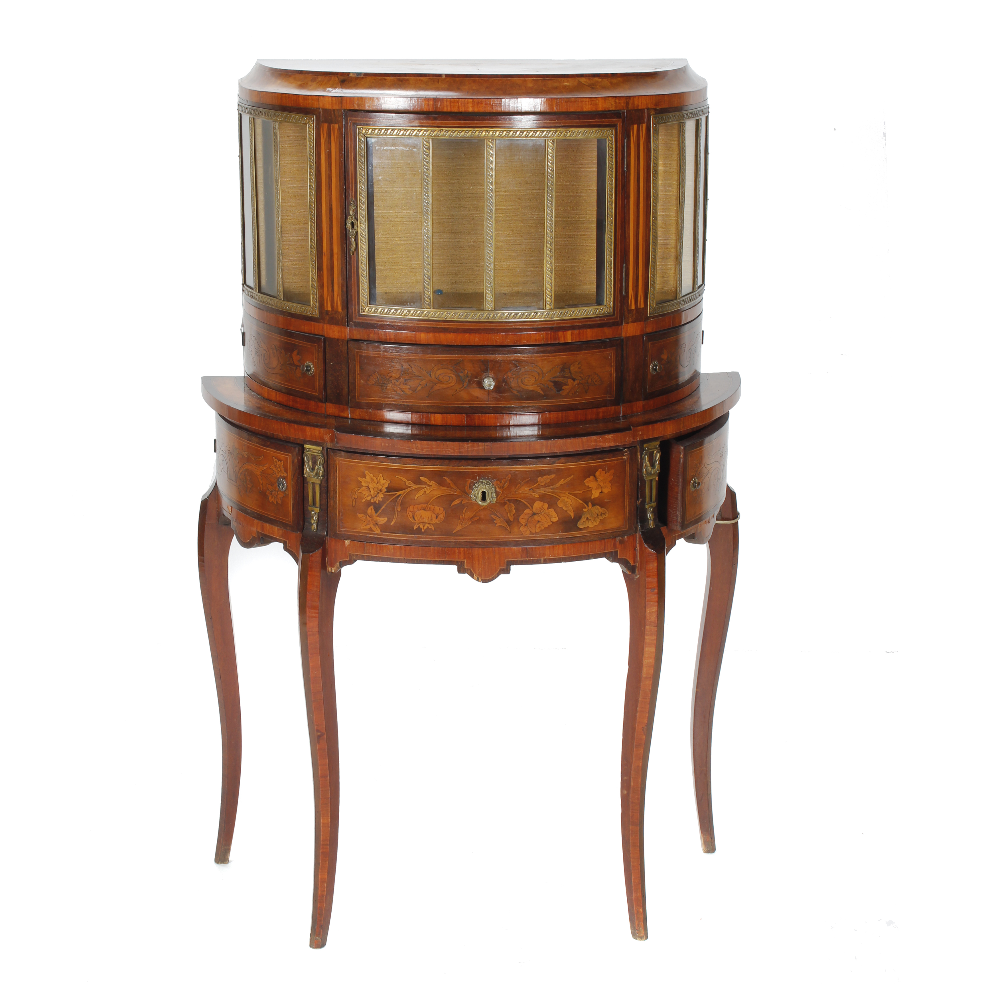 Carved wood with fine wood decoration and metal applications. Crystal doors.