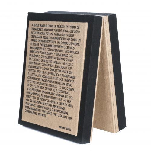 On the occasion of the 50th anniversary of the creation of Sèrie negre, ARTIKA and Fundació Antoni Tàpies reproduced the 15 drawings that made up the complete series and that the artist produced in 1967 on laid paper, creating a limited edition of 998 copies in Arabic numerals and 298 in Roman numerals, all framed in a silkscreen-printed hessian cloth case, divided into two parts. One part contains the volume of studies, with a silkscreen-printed text by Tàpies. The other part of the case is a display case made of hessian cloth and glass that allows the 15 facsimile sheets that make up Sèrie negre to be displayed one by one. All sheets have been printed on handmade paper of the highest quality, each one is numbered and includes the stamp of the Fundació on the back.