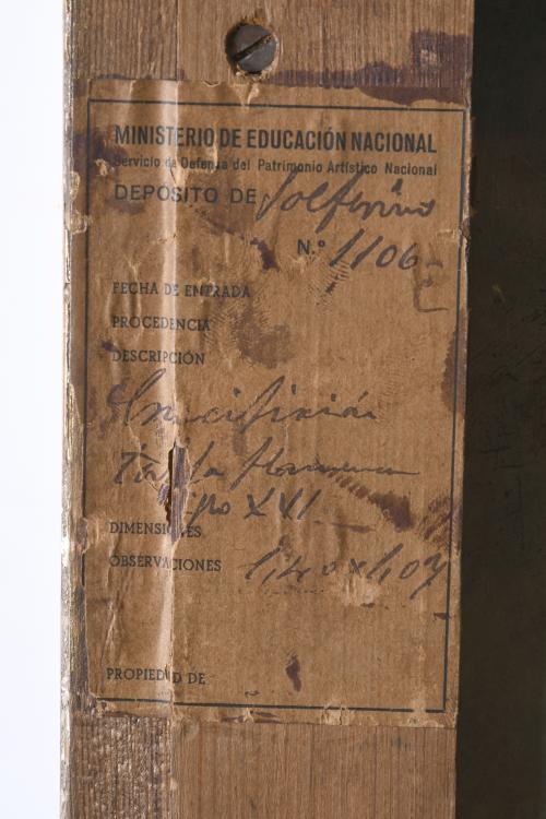 The reverse has a grisaille painting depicting the iconography of Jacob's ladder, with two (?) old labels of the Spanish Ministry of National Education with a registration number.