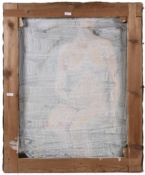 The canvas has been reused for this work, as a seated nude female figure can still be seen on the back, which has been covered with white paint.