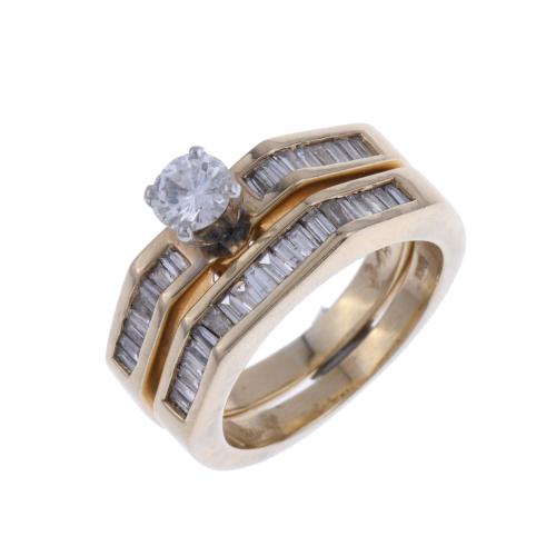 Double hoop in yellow gold with trapeze cut diamonds and a 0.25 ct brilliant cut diamond.