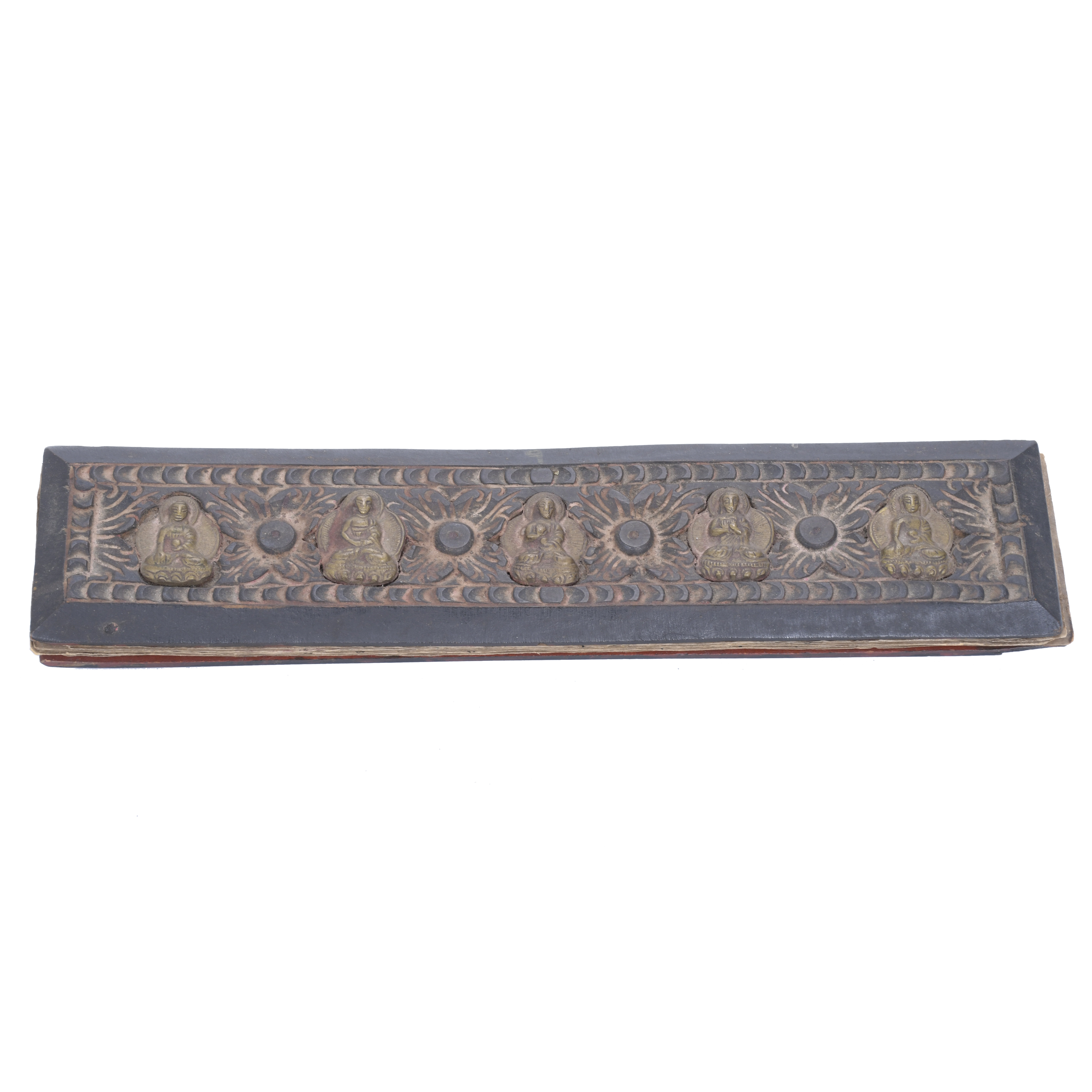 Open case in carved wood with gilt bronze applications. With ten paper pages with illuminated calligraphy and Buddhas.