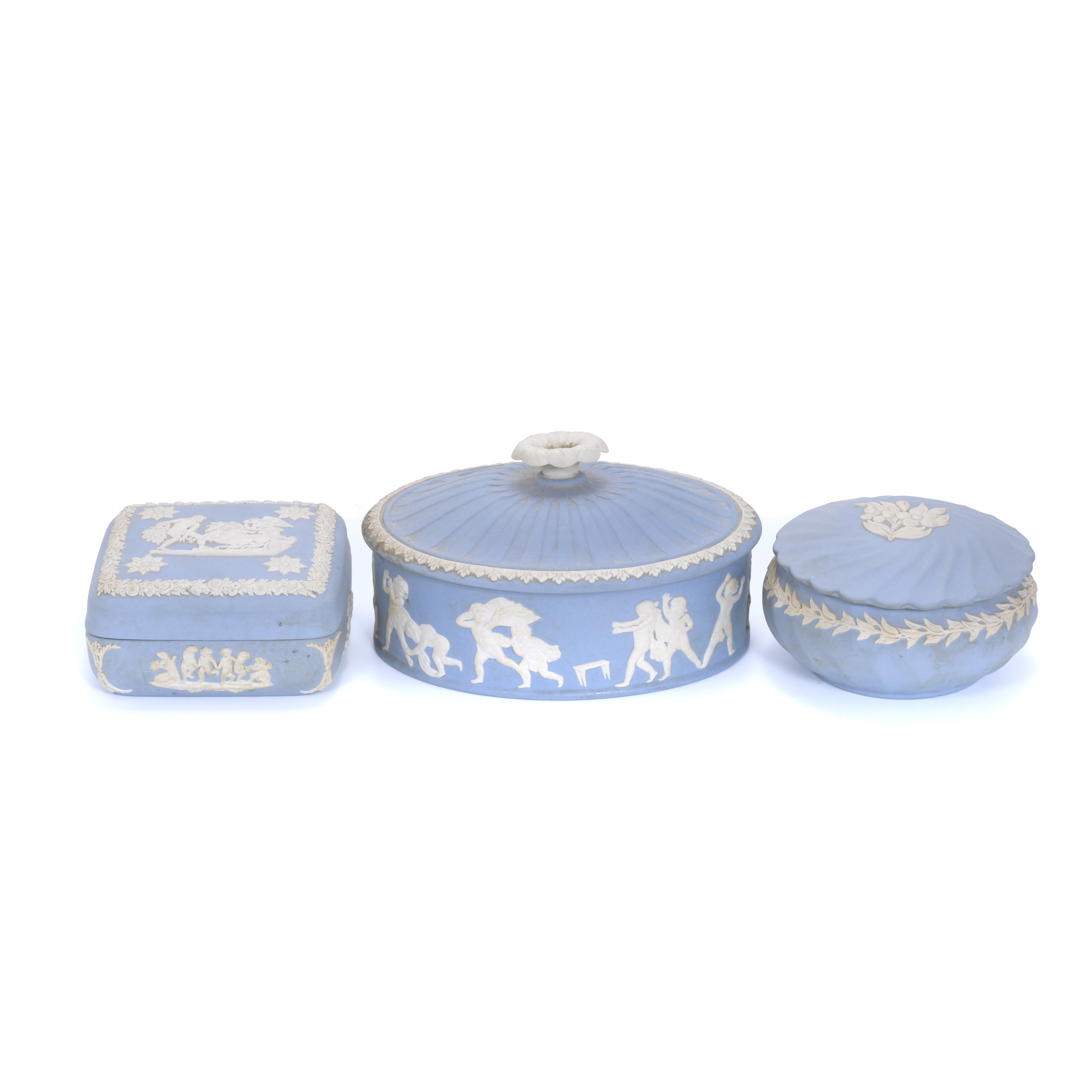 252. WEDGEWOOD MANUFACTURE. THREE PORCELAIN CHOCOLATES JARS.