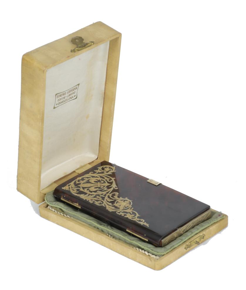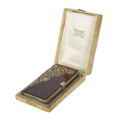 Gilt metal case with three compartments, one with mirror. Lids in tortoiseshell simile with chiselled metal floral decoration.