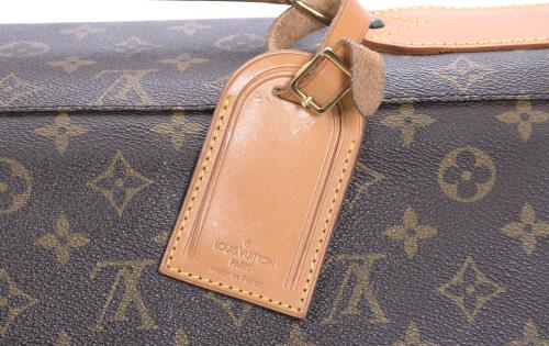 Canvas with monogram print and leather handles and applications. It contains a suit bag, a large pocket and three adaptable hangers on the inside.