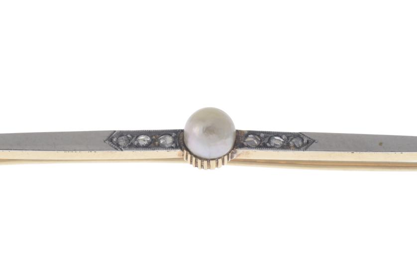 Setting in 18kt yellow gold and 18kt white gold views. Old cut diamonds, cultured pearl of 5 mm.