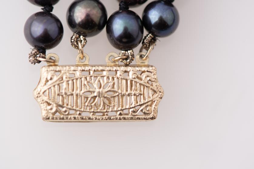 14 kt yellow gold clasp and 14 kt yellow gold break bars.