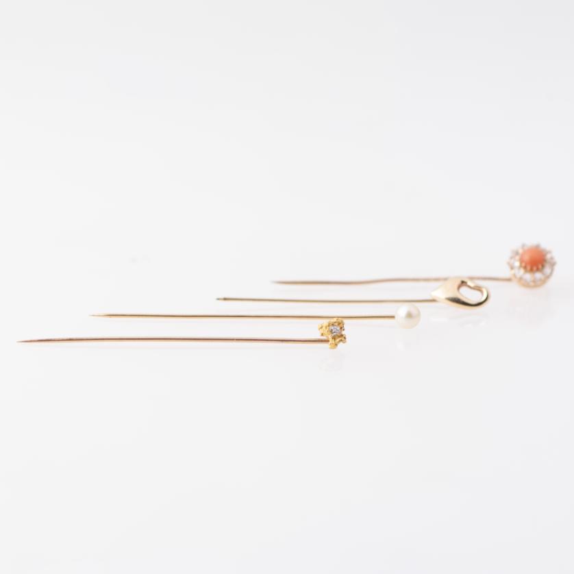 One with a cultured pearl, another with coral simile and zircons, and another with a brilliant cut diamond.