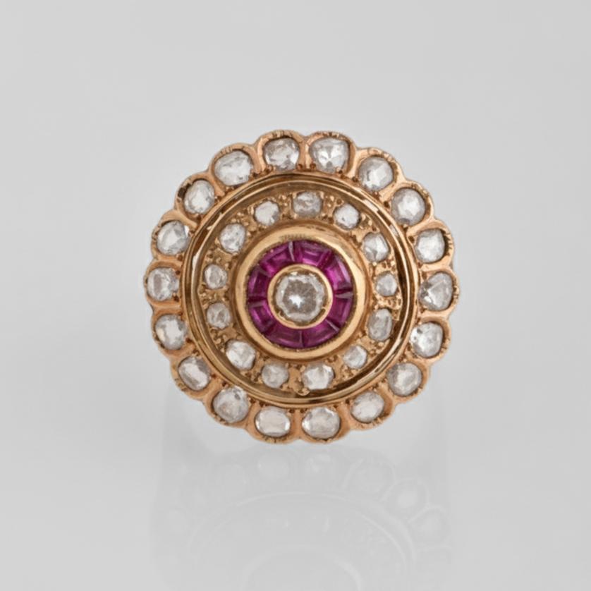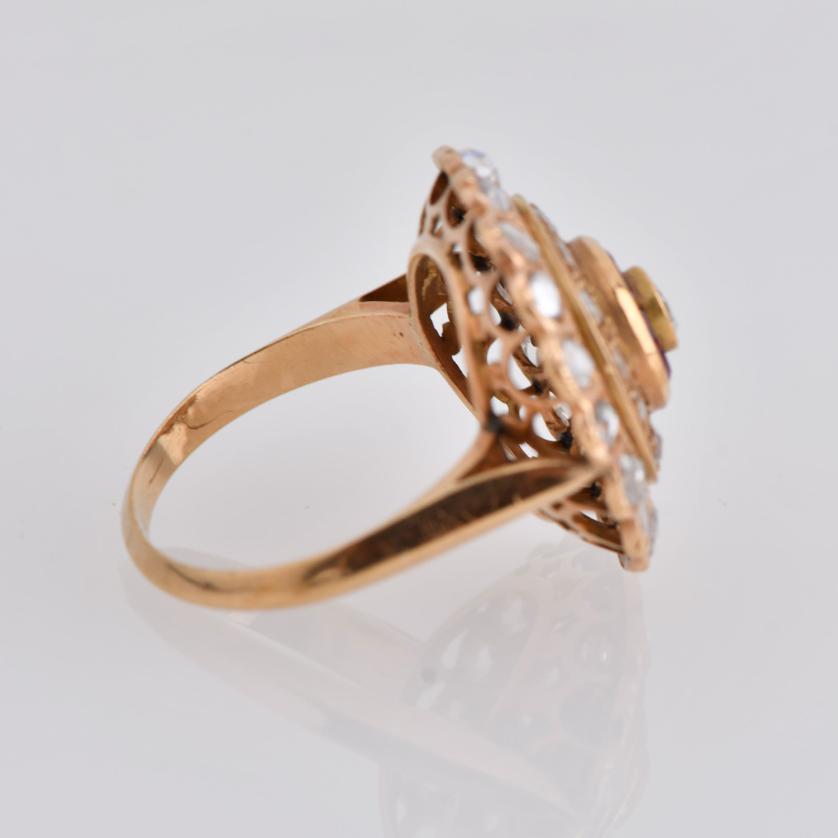 18 kt yellow gold. Old cut diamonds and princess cut ruby.