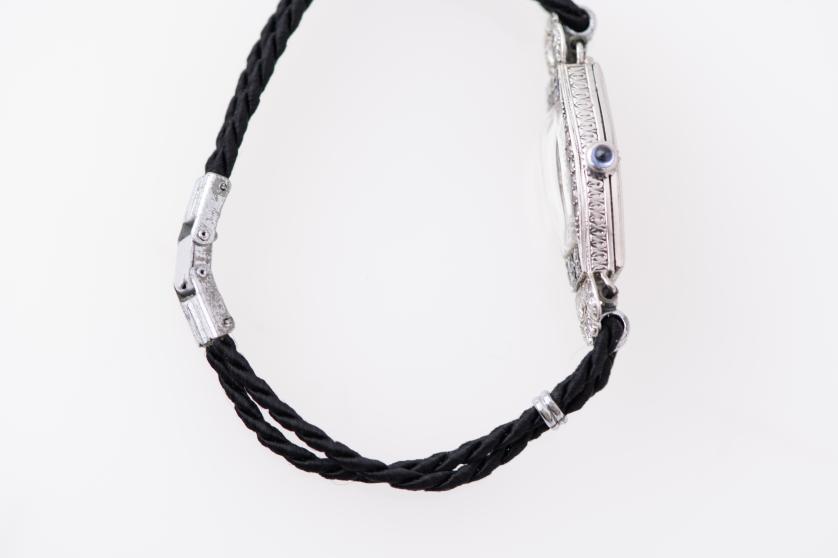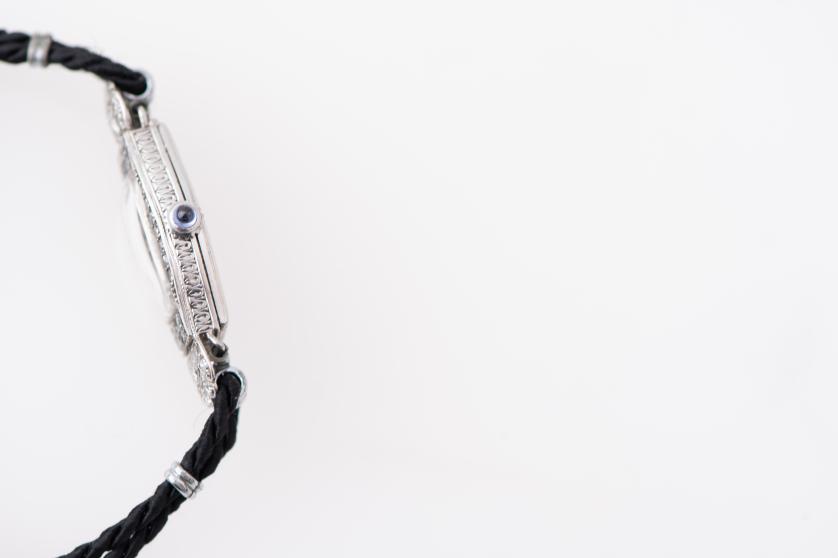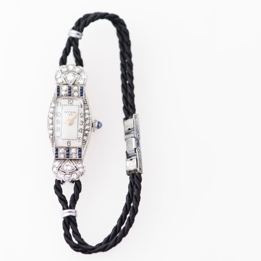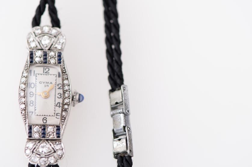 With square and cabochon cut sapphires on the crown, and transition cut diamonds.