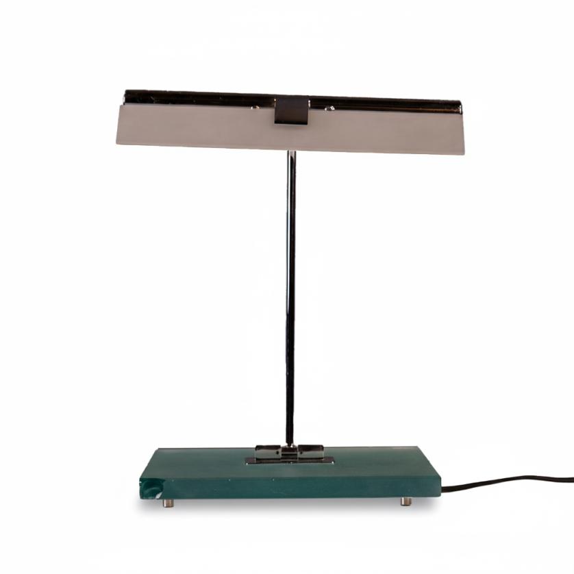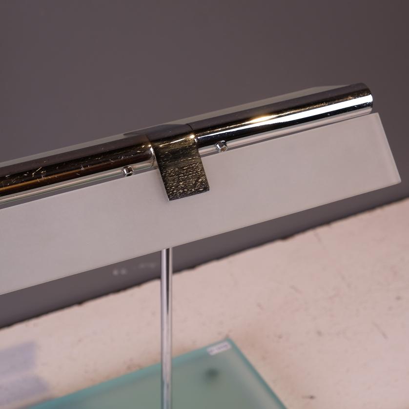 Oscillating metal table lamp with shade and acid-etched glass base.