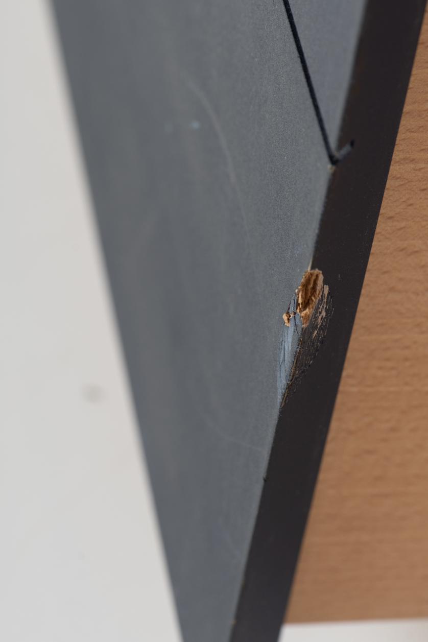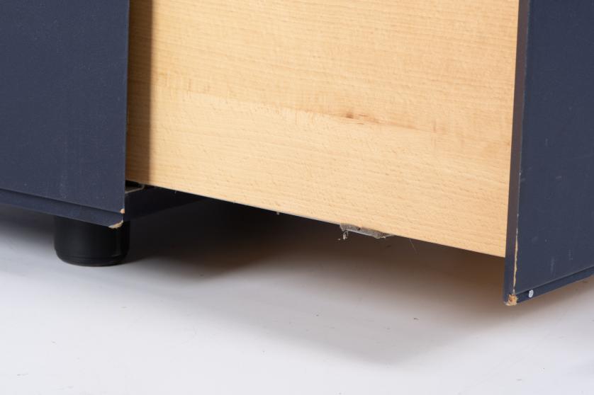 Made of stained plywood with navy blue leather handles.