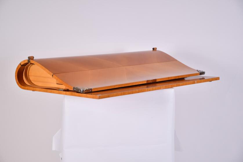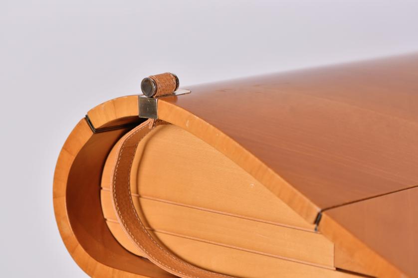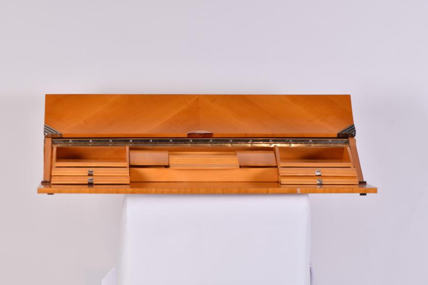 Light walnut secreter with sycamore interior. Silver-plated fittings and leather straps.