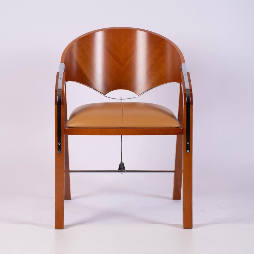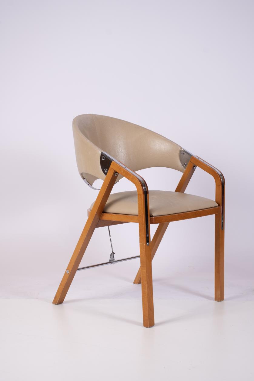 Armchair in light walnut, upholstered in dark beige imitation leather. Silvery nickel fittings.