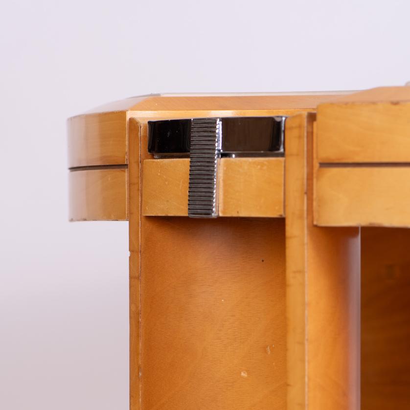 Light walnut gaming table with leather upholstery and cloth-covered underside. Nickel fittings. Light walnut chairs upholstered in beige leather, with nickel fittings.