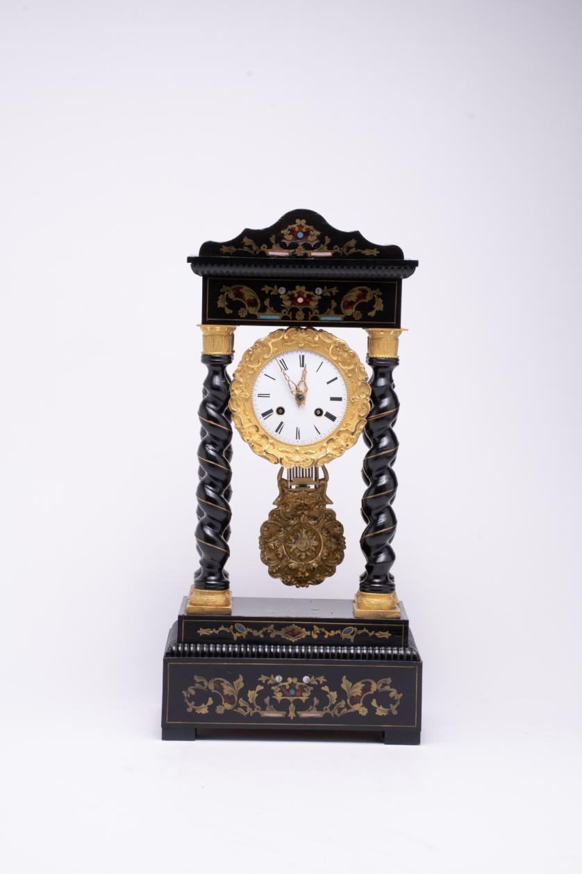 Ebonised wood with brass and tortoiseshell-simile marquetry. Enamel details. Gilded bronze details.