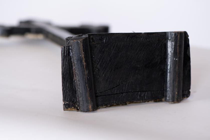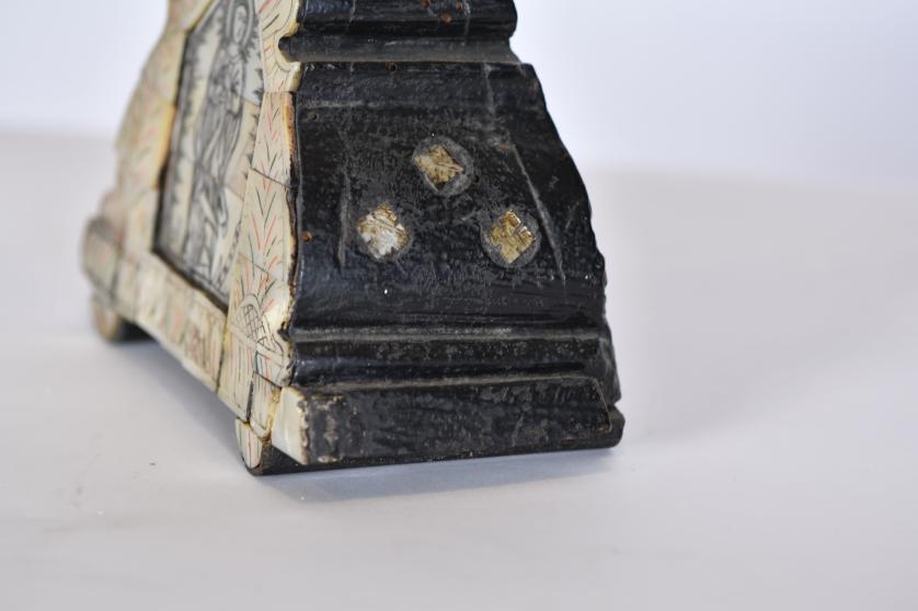 Ebonised wood and engraved and inked mother-of-pearl plaques.