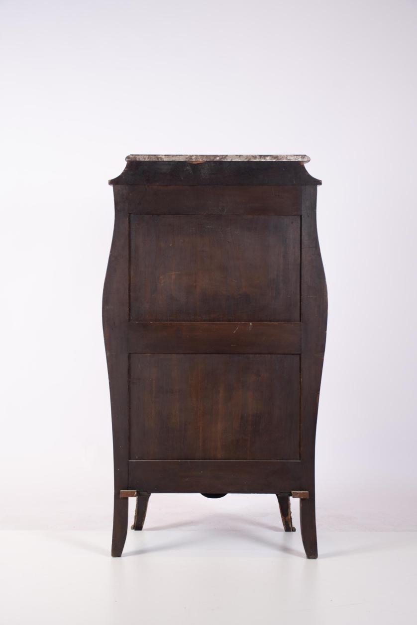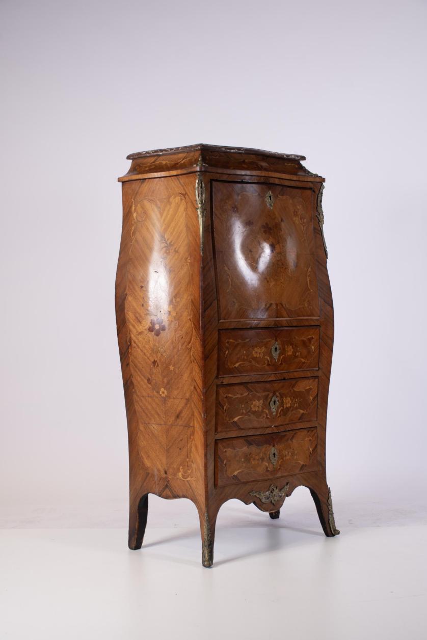 Structure and interior of the drawers in river wood and oak. Surface decorated with fine wood marquetry and floral motifs. Marble top. Gilded bronze feet, fittings, keyholes and applications.
