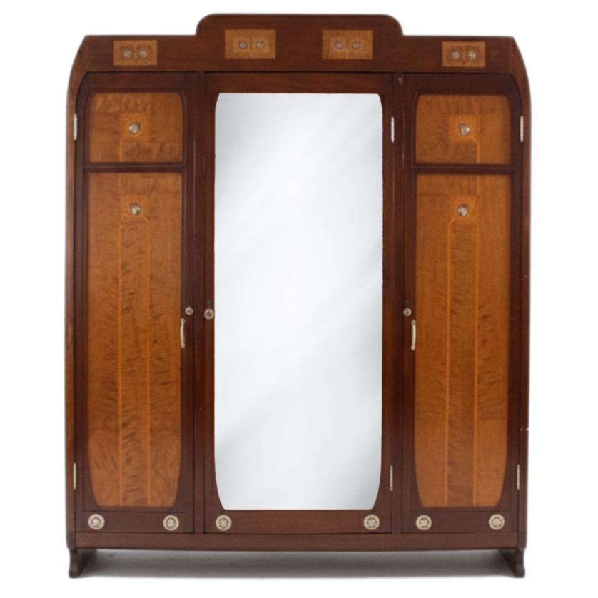 Walnut wood with fine wood and metal marquetry inlays. Large bevelled glass on the central door.