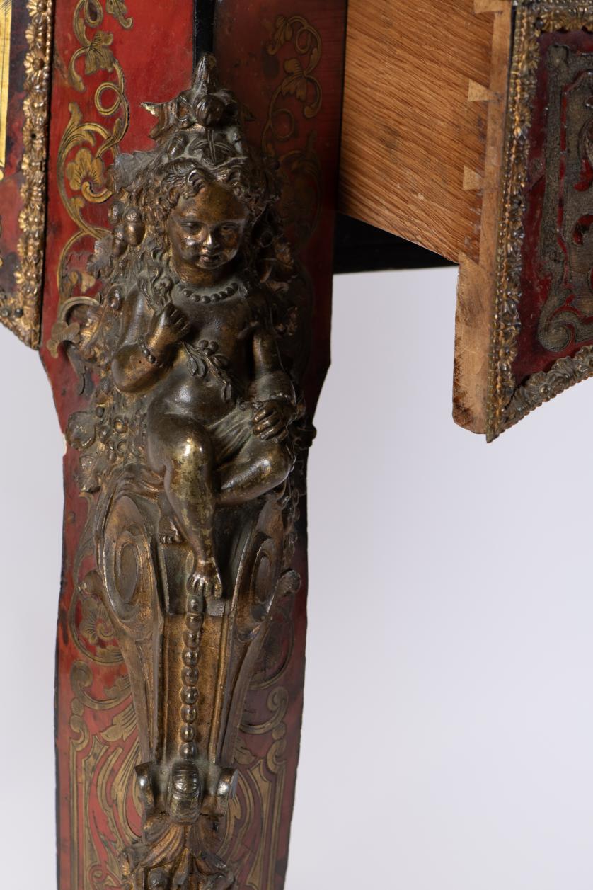 Ebonised wood structure, Boulle marquetry with tortoiseshell simile and brass. Glass top. Gilded metal applications depicting cherubs and shoes.