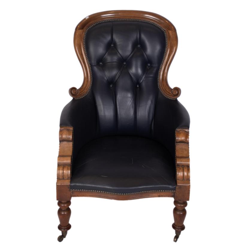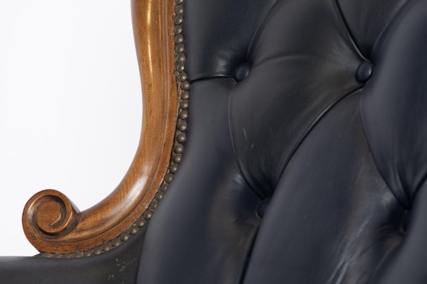 Mahogany and walnut wood structure, probably. Tufted upholstery on the backrest. With brass wheels.
