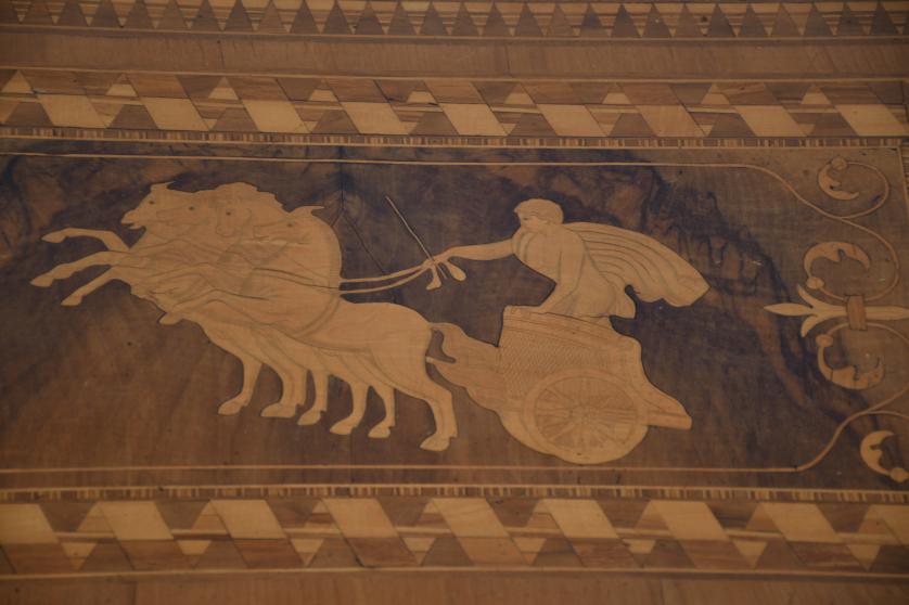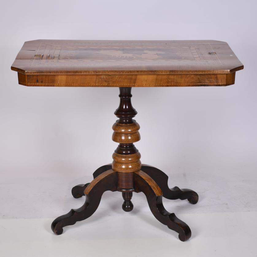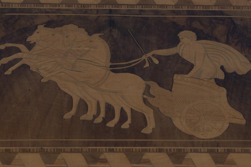 Base in turned walnut wood with scalloped cabriole legs. Top in fine wood marquetry depicting a Roman charioteer and geometric marquetry details.