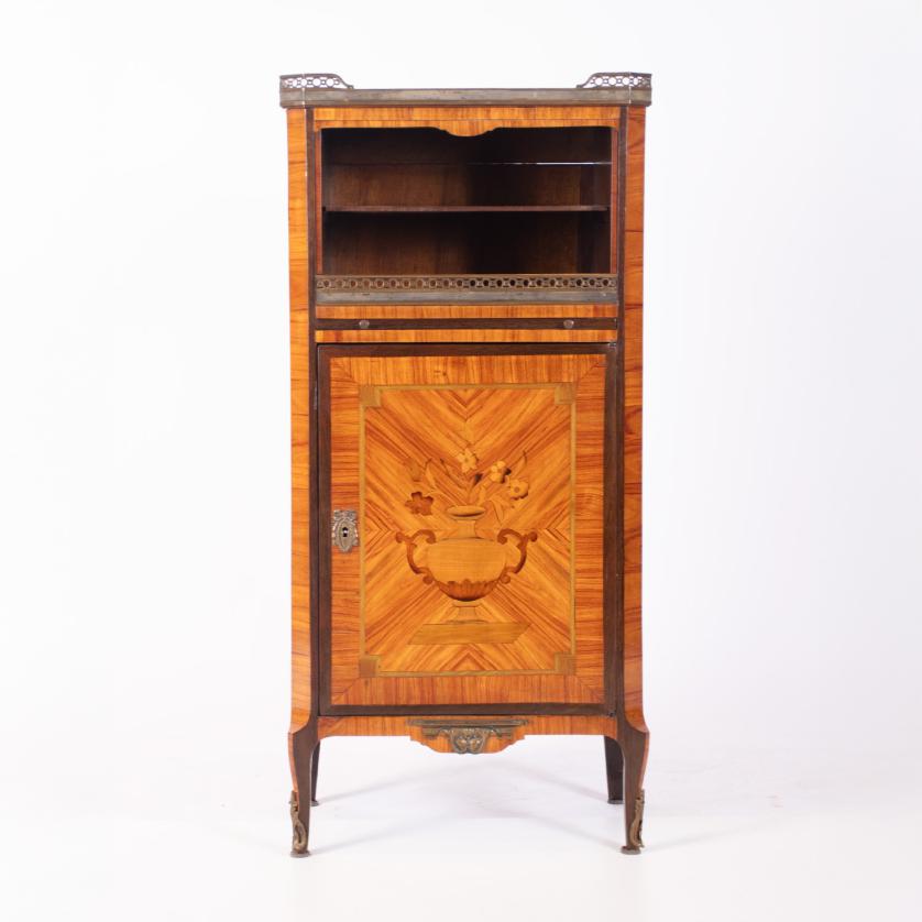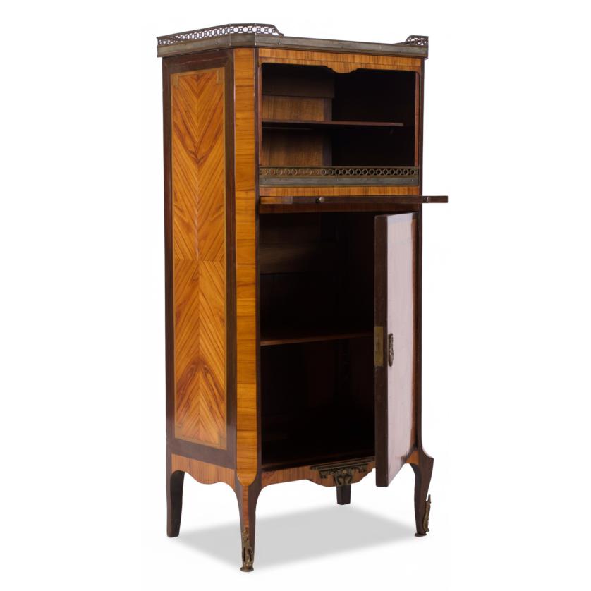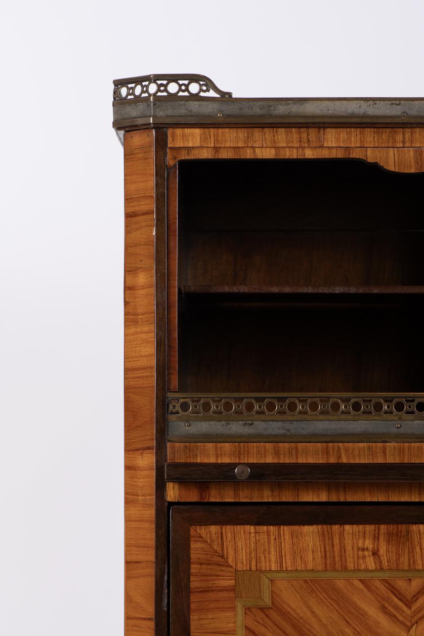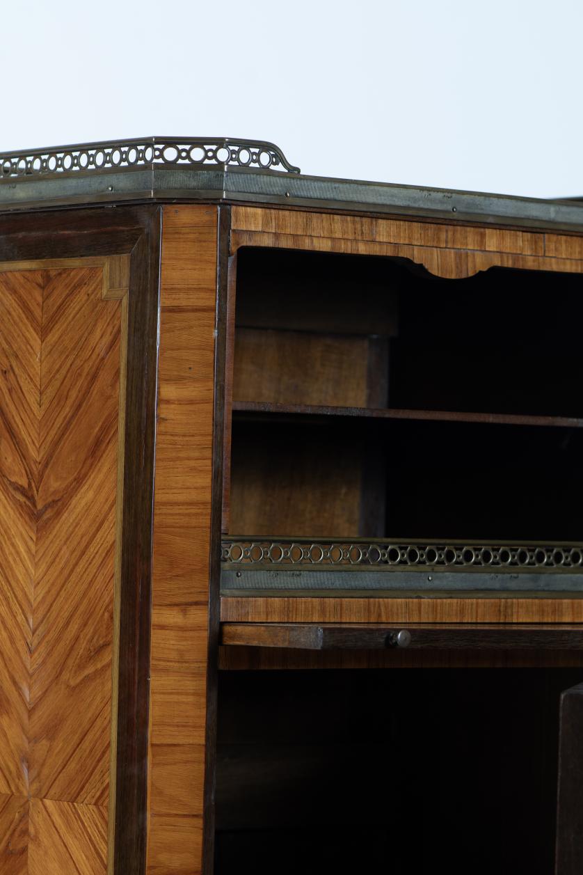 Oak and pine wood structure, mahogany wood shelves and surfaces, fine wood marquetry. Marble top. Bronze details.