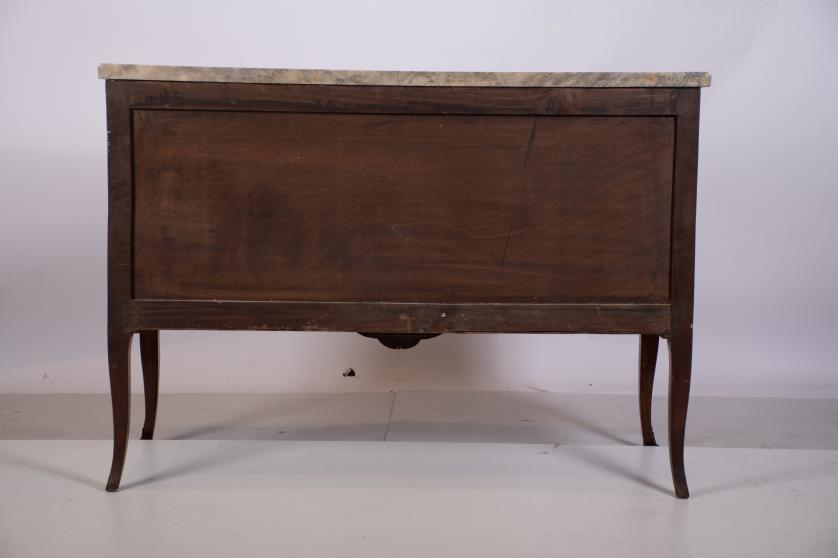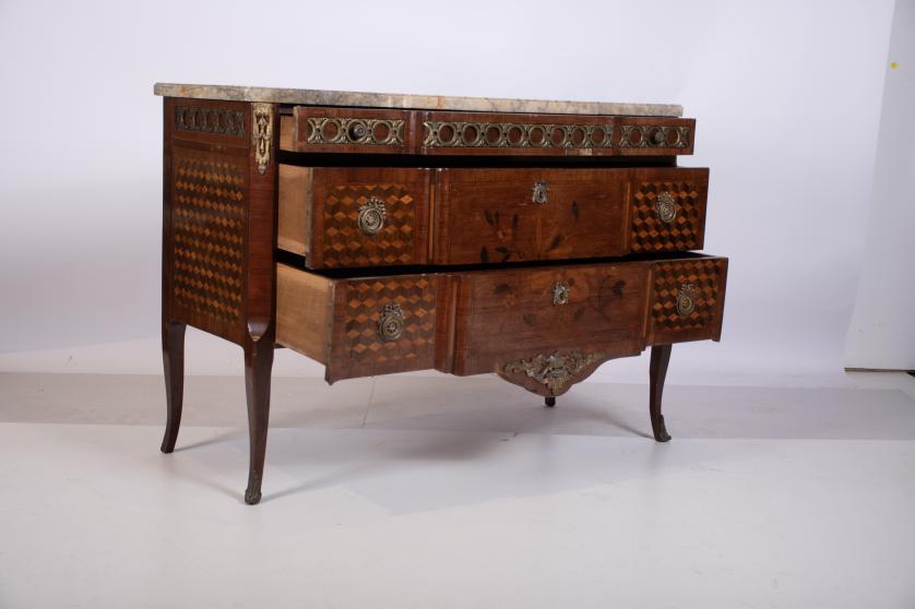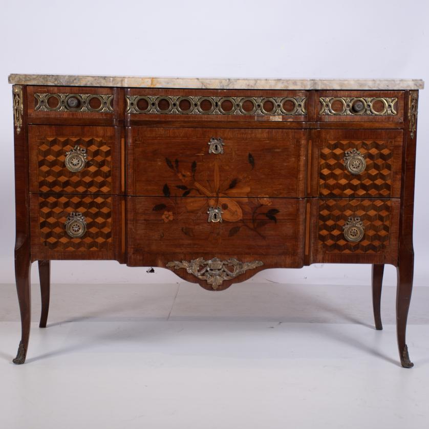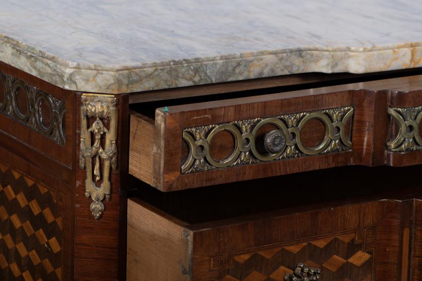 Marquetry in rosewood, mahogany, other fine woods and ebonised wood. Details in gilded bronze. Keyholes and handles in gilded metal. Veined marble top. Front feet in gilded metal.
