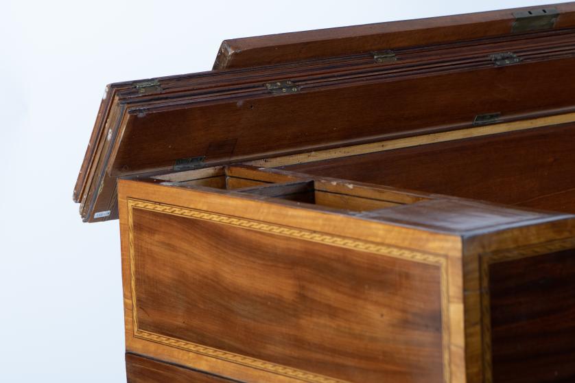 Varnished mahogany wood, with fine wood marquetry details and boxwood fillets. Brass wheeled castors.
