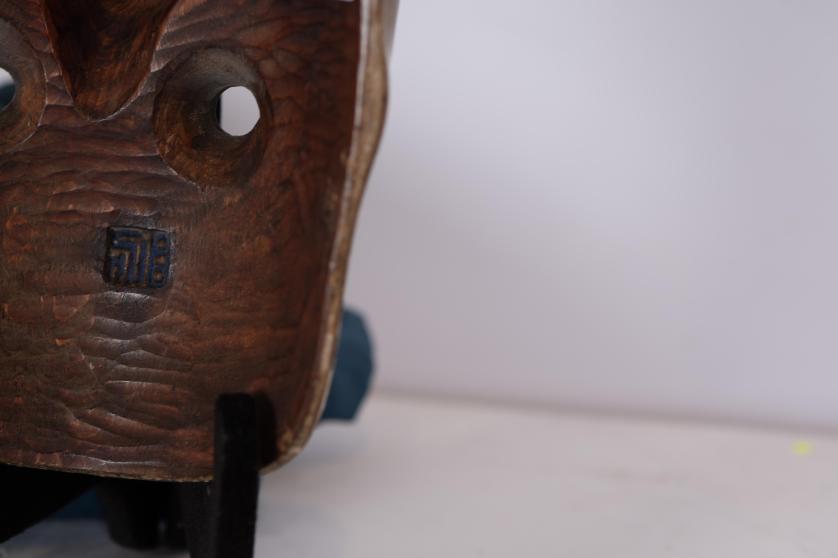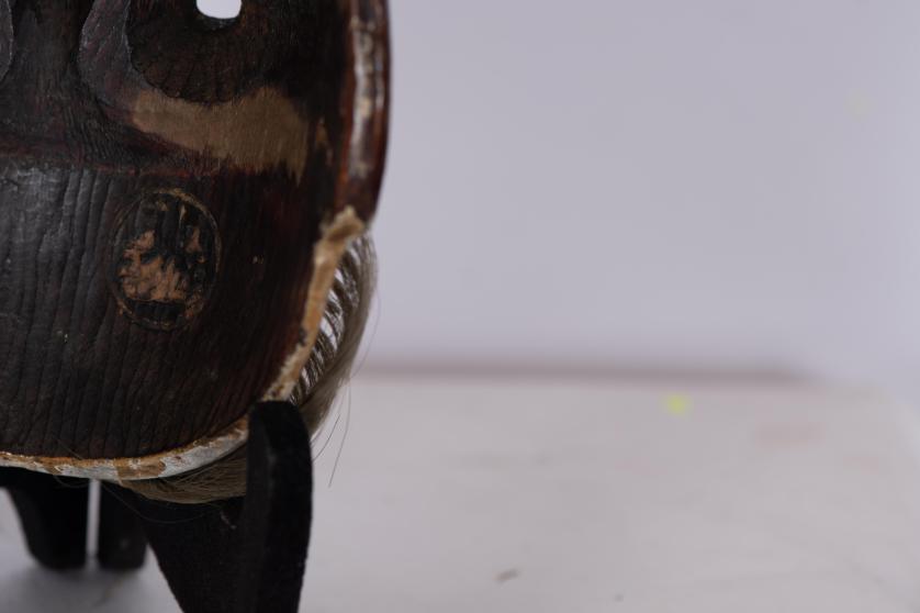 The stamp on the Yase-Otoko mask could be attributed to the artist Kodama Oumi, who was active in the late 17th century and whose last recorded work dates from 1704. He is also known as Kodama Omi Mitsumasa or Tenkaichi Omi and is considered one of the most renowned mask carvers from the Edo period.