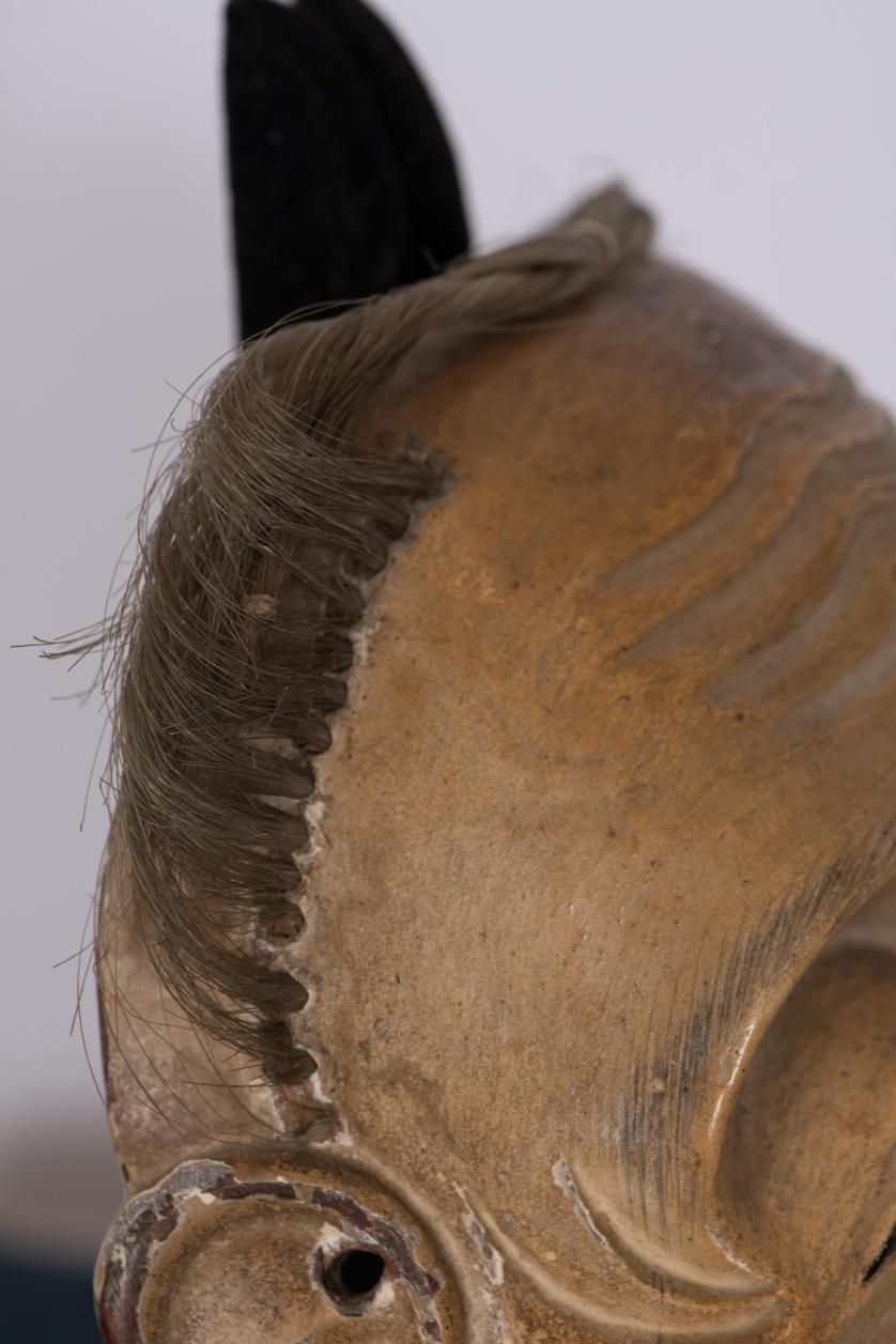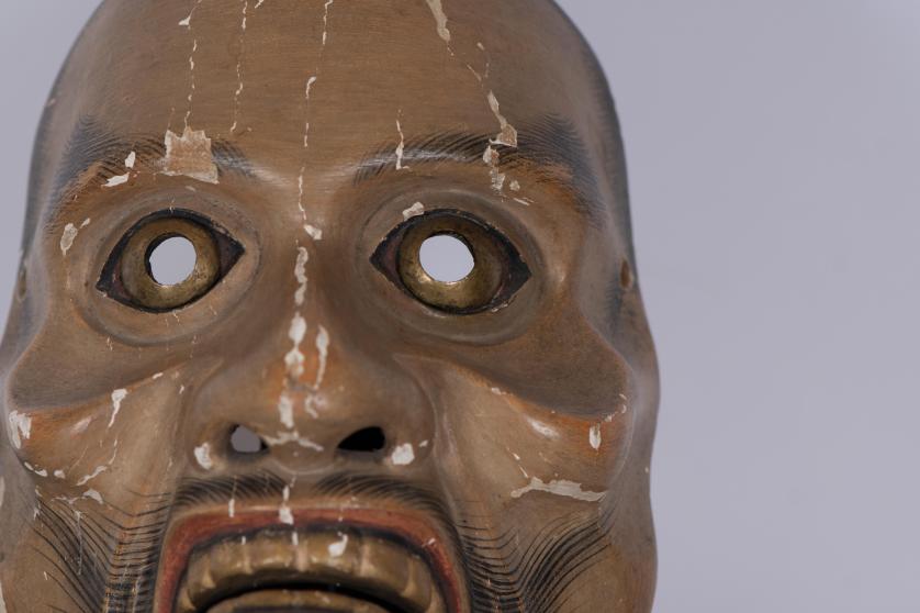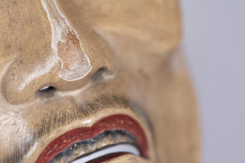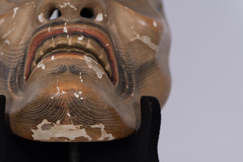 The Sankoujou mask is a 19th-century reproduction of a mask made by the famous copyist Tenka-ichi Kawachi, who was a master in the 17th century specialising in accurately copying classic Nō masks. His skills earned him the title of ‘Tenkaichi’, a title given to elite craftsmen who faithfully reproduced masks from the past.