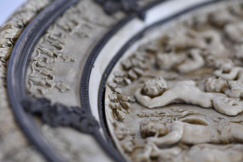 Elephant ivory and silver. With mythological scenes in bas-relief, such as a bacchanal and centauromachy.
