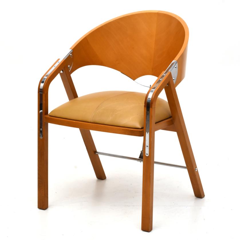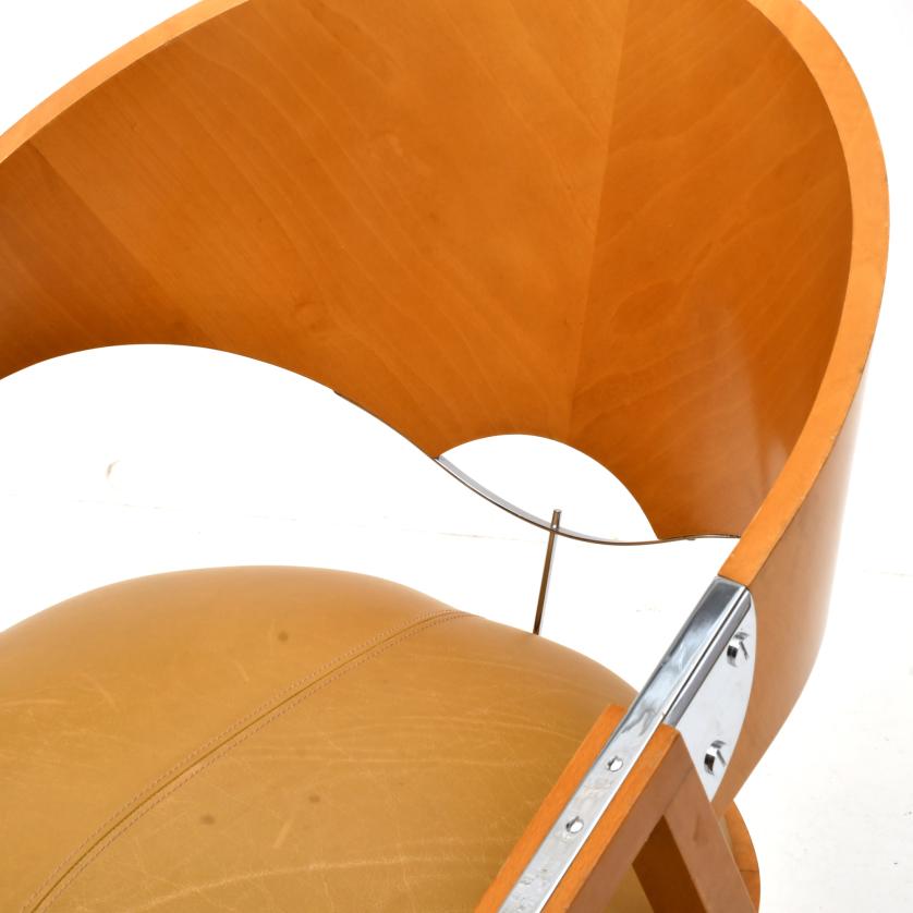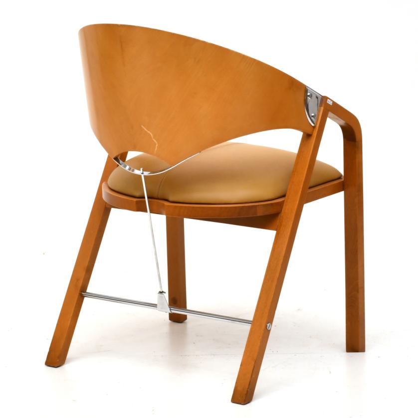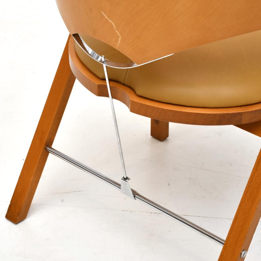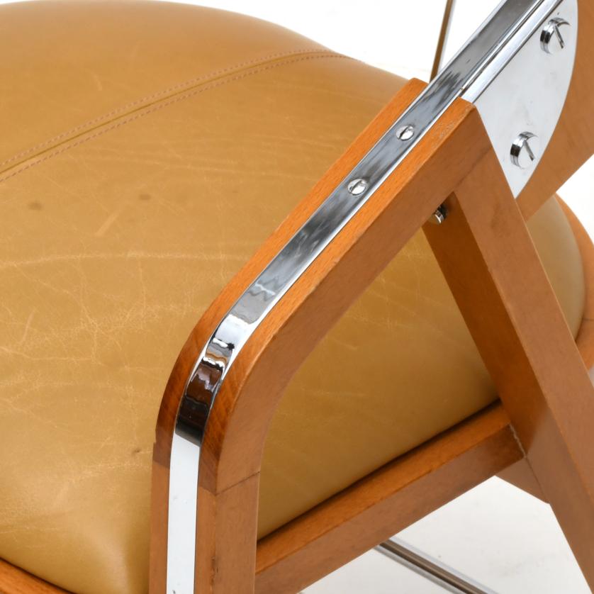 Armchair in light walnut, upholstered in camel-coloured imitation leather. Silvery nickel fittings.