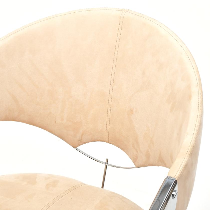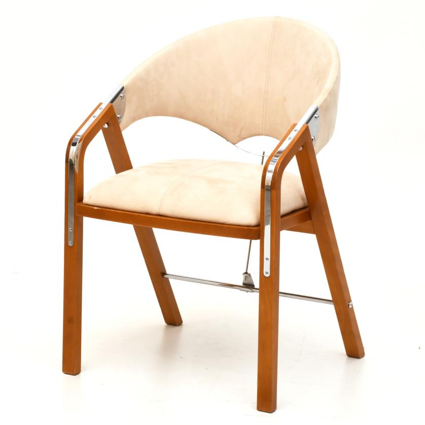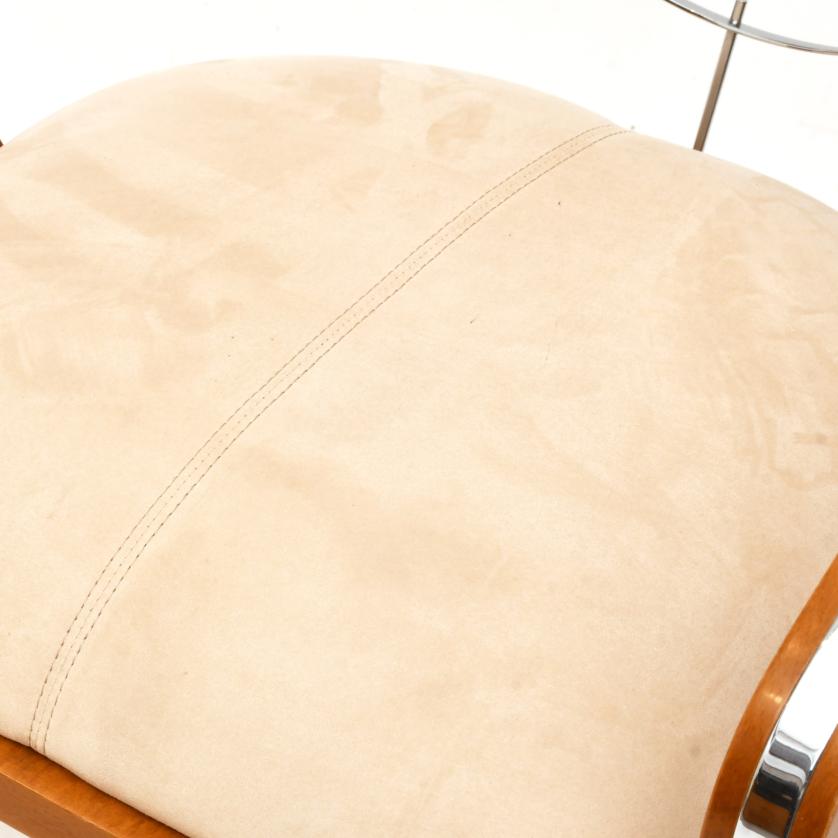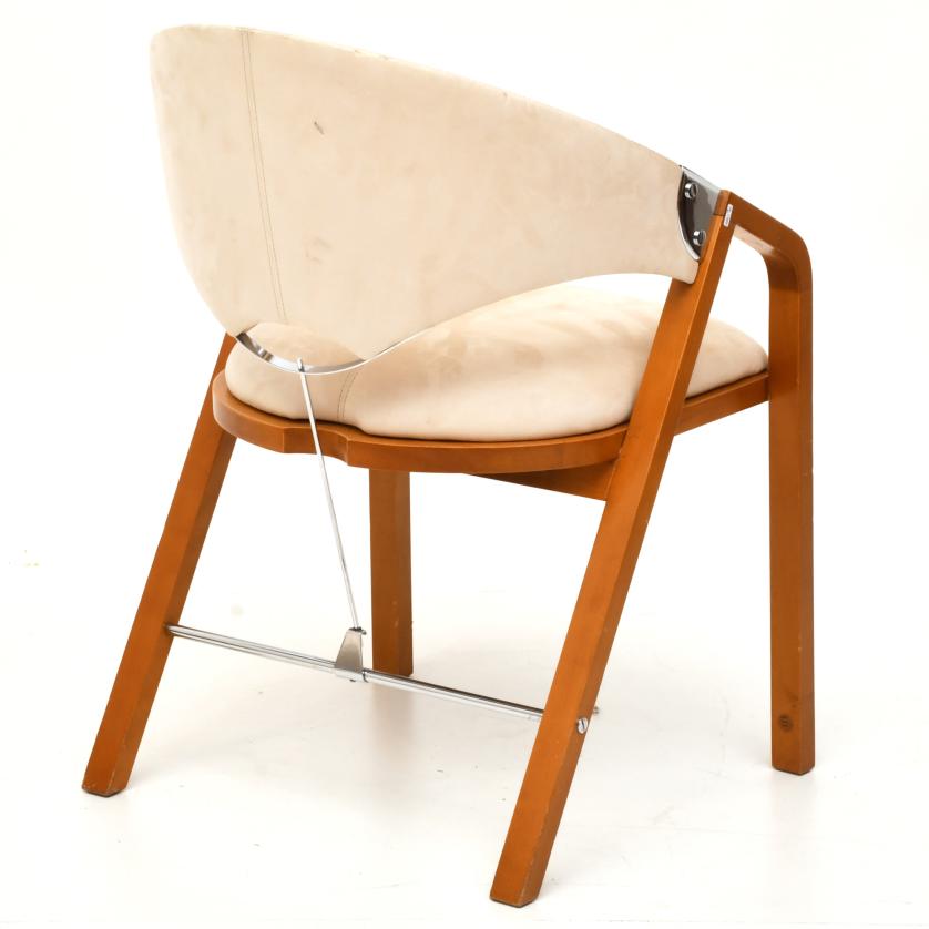 Armchair in light walnut, upholstered in cream-coloured imitation leather. Silvery nickel fittings.