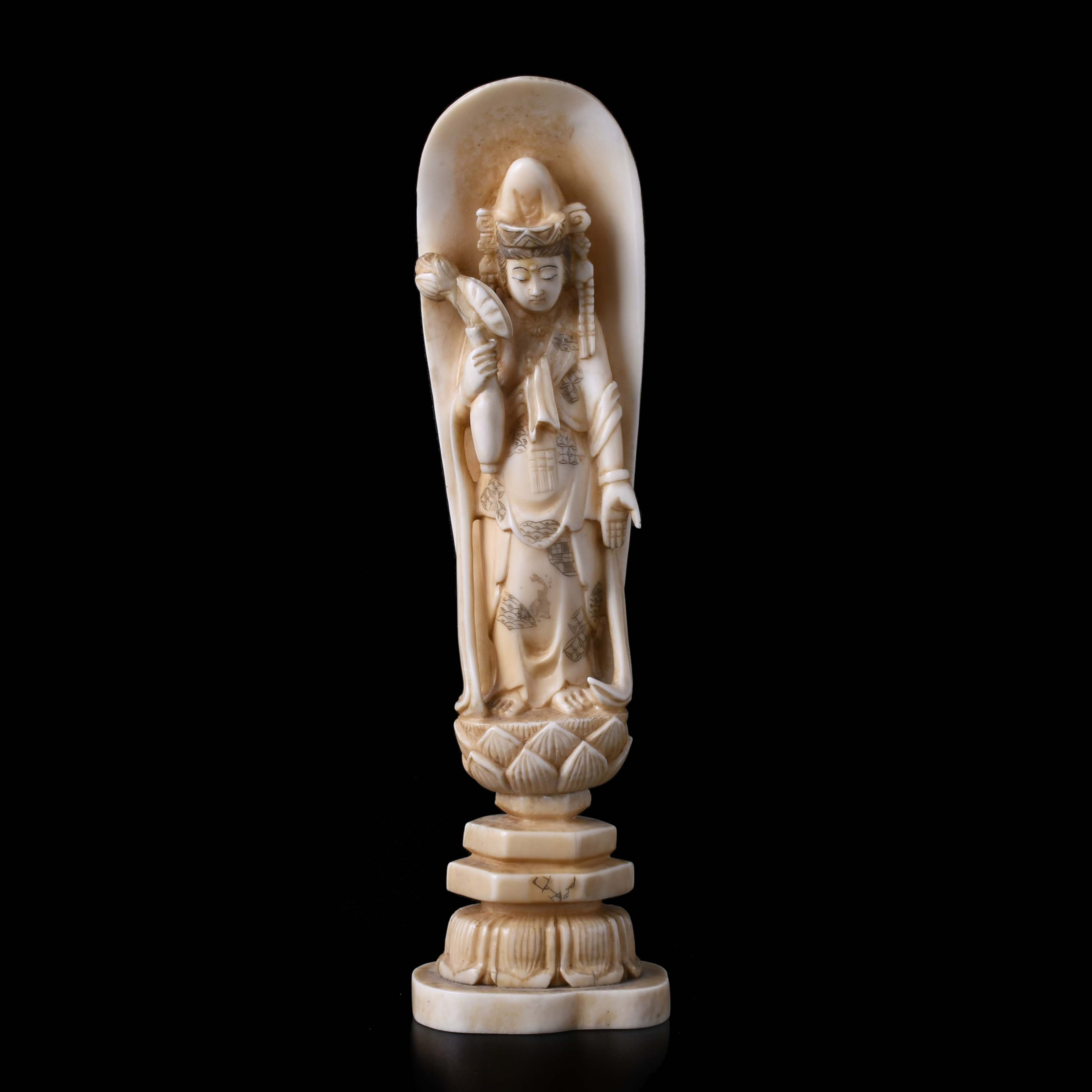 127. JAPANESE SCHOOL. MEIJI PERIOD, 19TH CENTURY. OKIMONO, DEPICTING A KUAN YIN ON A LOTUS FLOWER, WITH HER ATTRIBUTES.