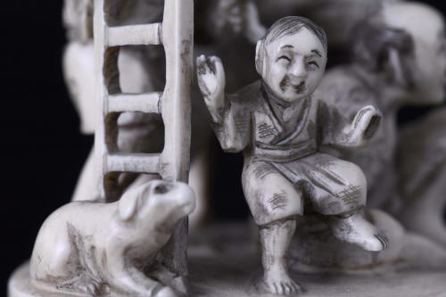 Netsuke in carved, engraved and dyed ivory.