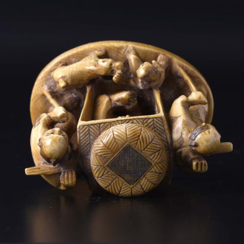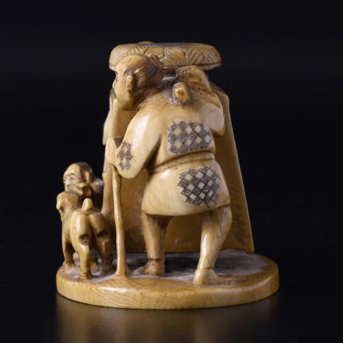 Netsuke / okimono in carved, engraved and dyed ivory.