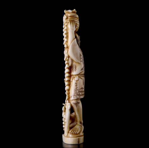 8. JAPANESE SCHOOL. MEIJI PERIOD, 19TH CENTURY. "PEASANT CARRYING A BASKET ON HIS HEAD WITH BUNCHES OF GRAPES STANDING ABOVE IT AND HOLDING A RABBIT IN HIS RIGHT HAND".
