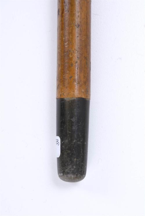 Vara o palo en madera enbarnizada, empuñadura en hueso tallado con forma de calavera y puntera en madera.