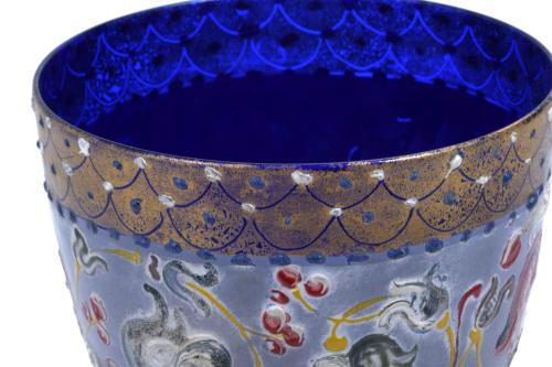 En vidrio soplado y pintado a mano con fuste o astil de forma abalaustrada.