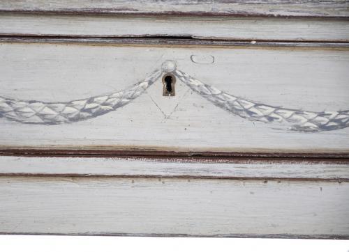 En madera tallada y patinada con ornamento decorativo pintado de guirnalda.