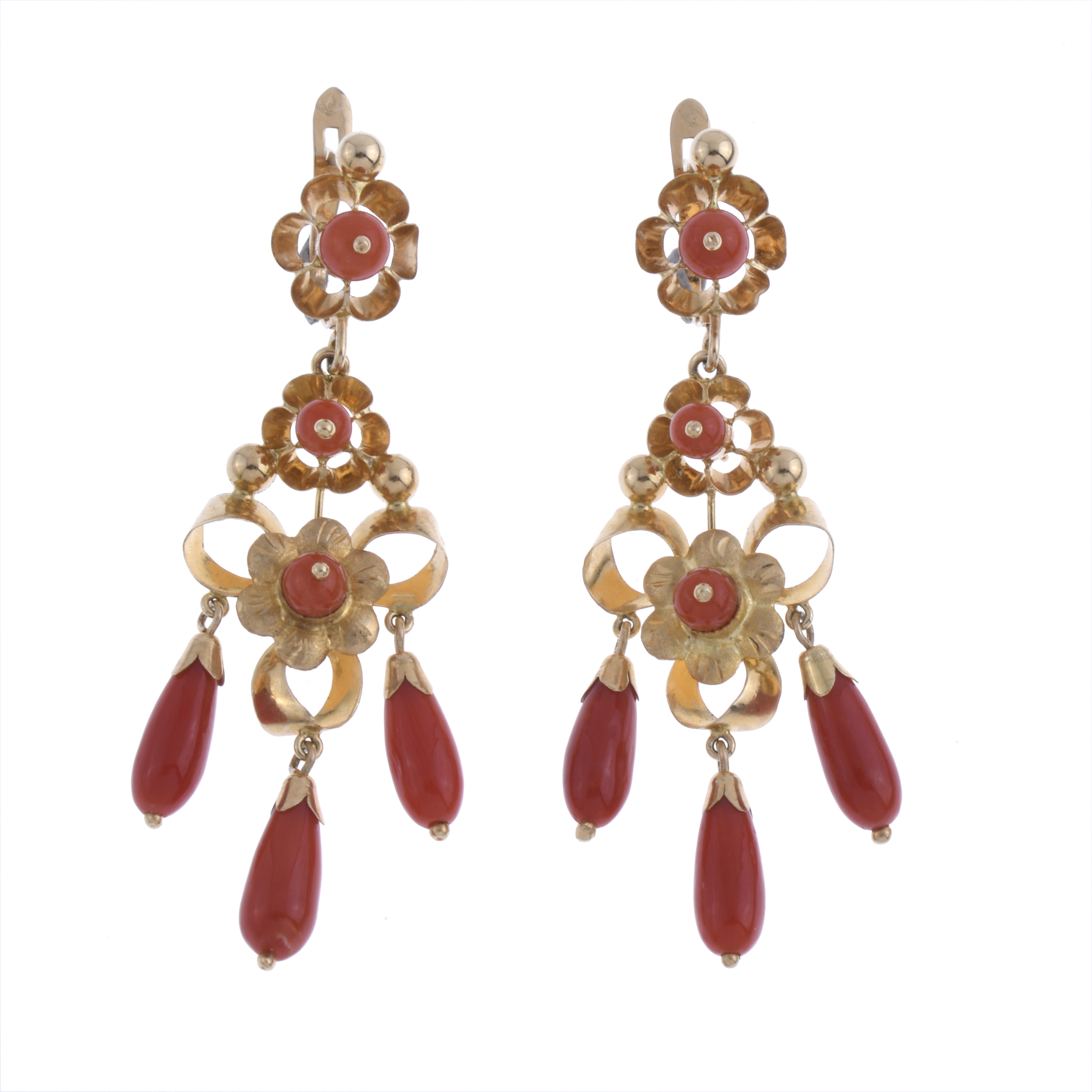 Oro amarillo en filigrana con cuentas en coral y lágrima colgantes.