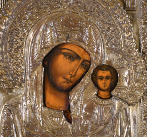Témpera sobre tabla, el oklad en metal plateado y dorado.