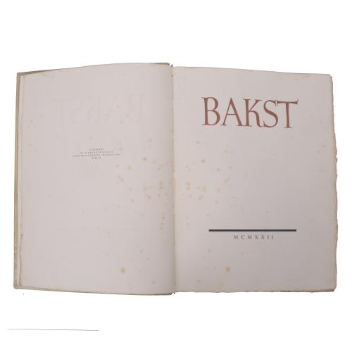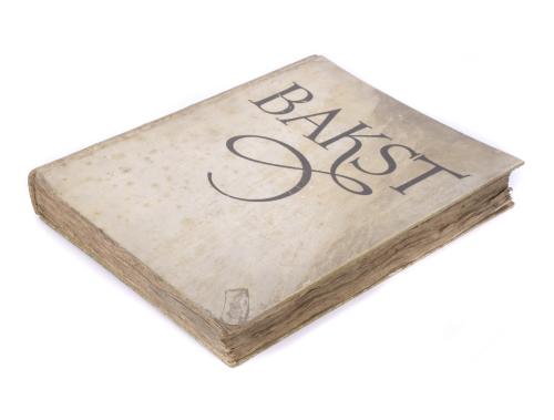 Encuadernación en pergamino rústico editorial con el nombre de BAKST estampado en el plano anterior y el lomo decorado.