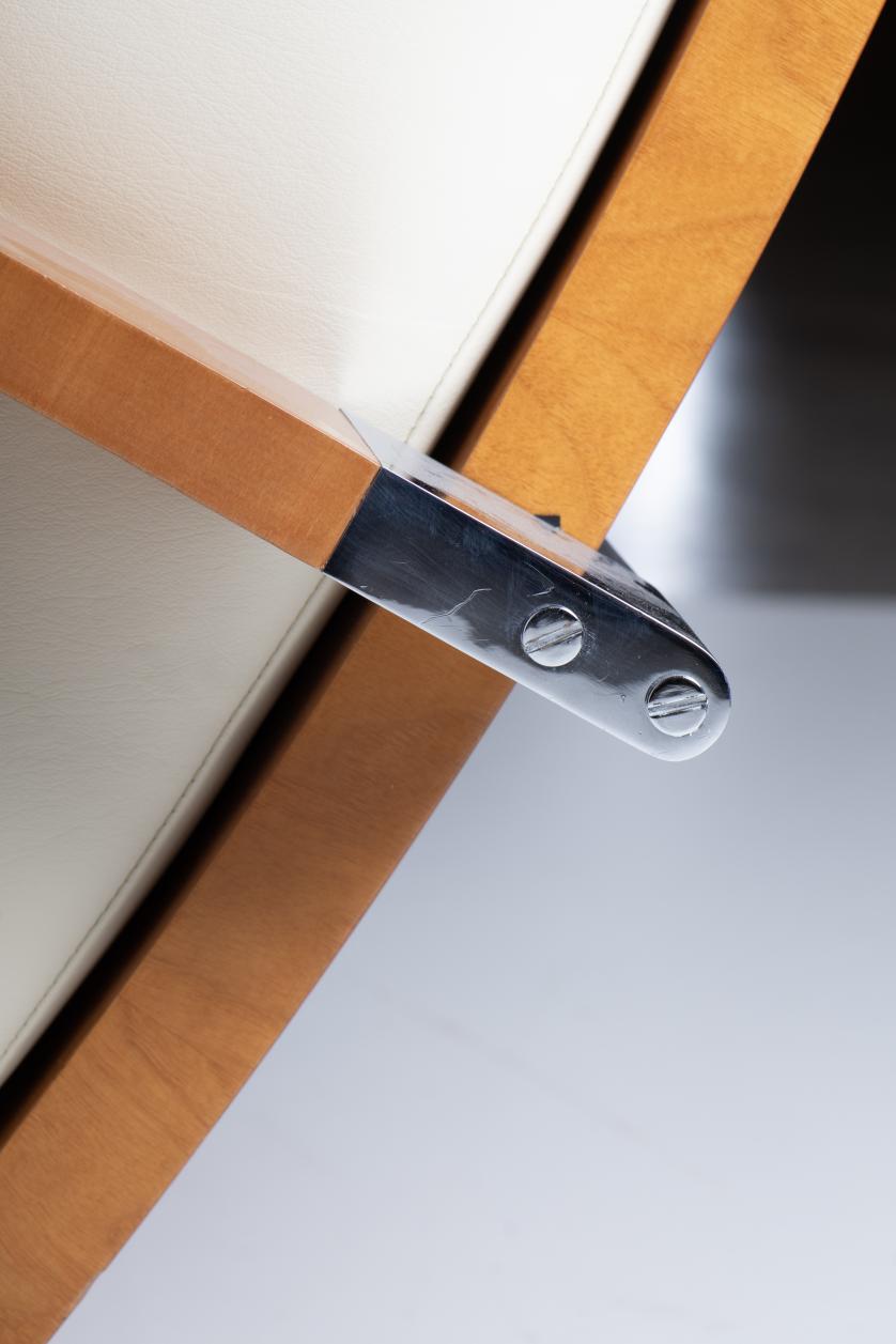 Estructura en nogal claro, herrajes en níquel plateado, tapizado en piel color crema.