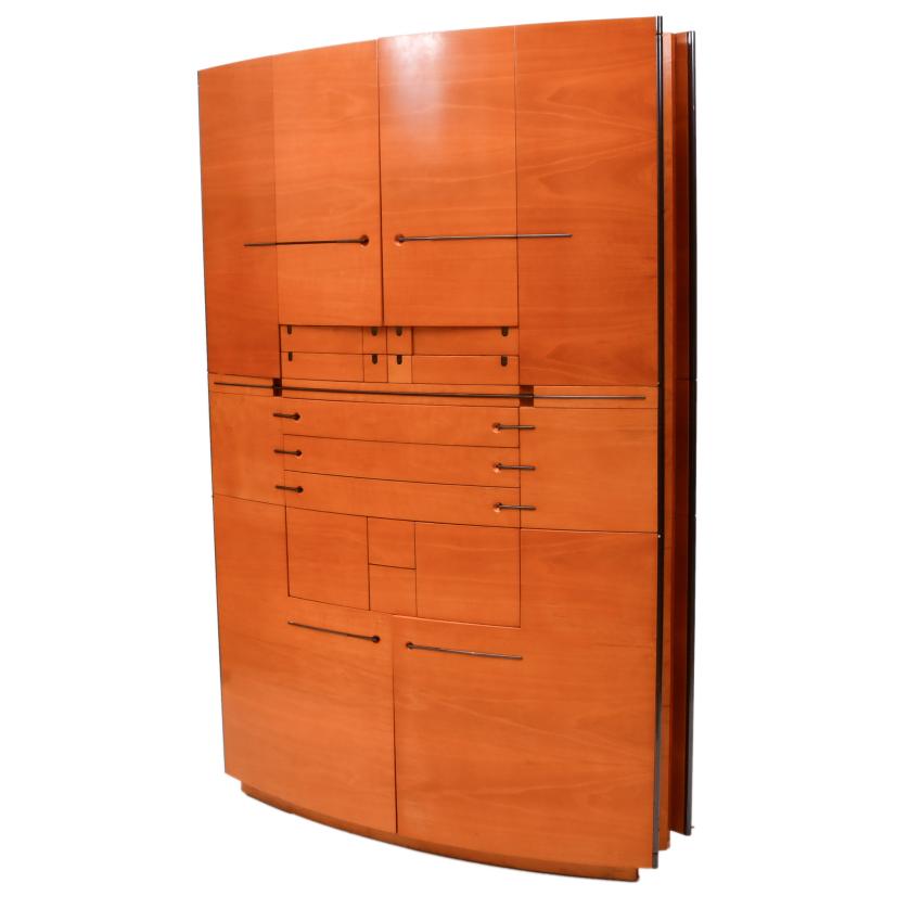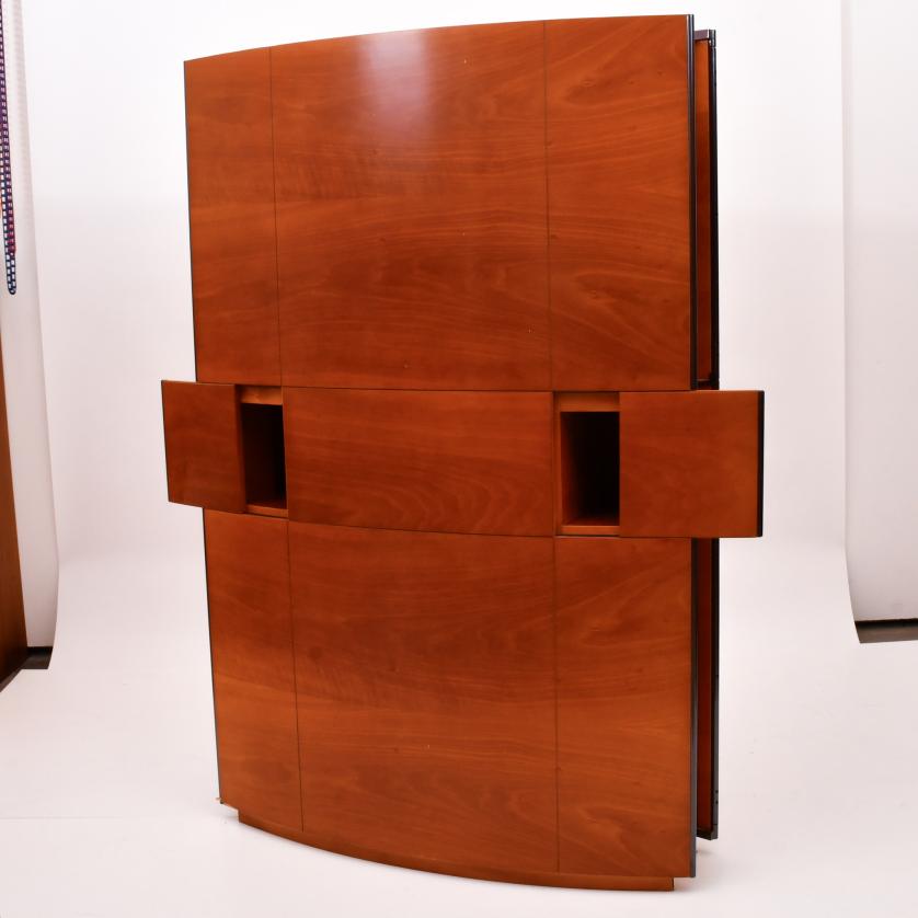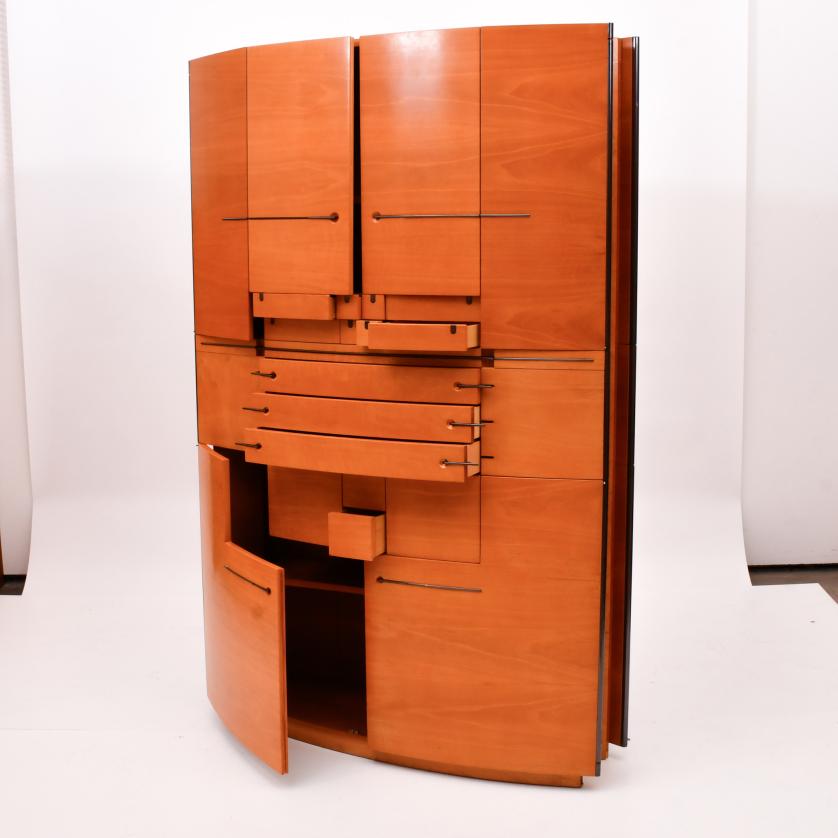 En madera de nogal clara con herrajes sulfurizados. Mueble de una estructura elegante, sobria y sólida, caracterizado por sus líneas depuradas, las cuales reflejan un fino trabajo de carpintería, así como el uso de materiales nobles. Cuenta con compartimentos internos pensados para que el mueble hibride practicidad con estética.